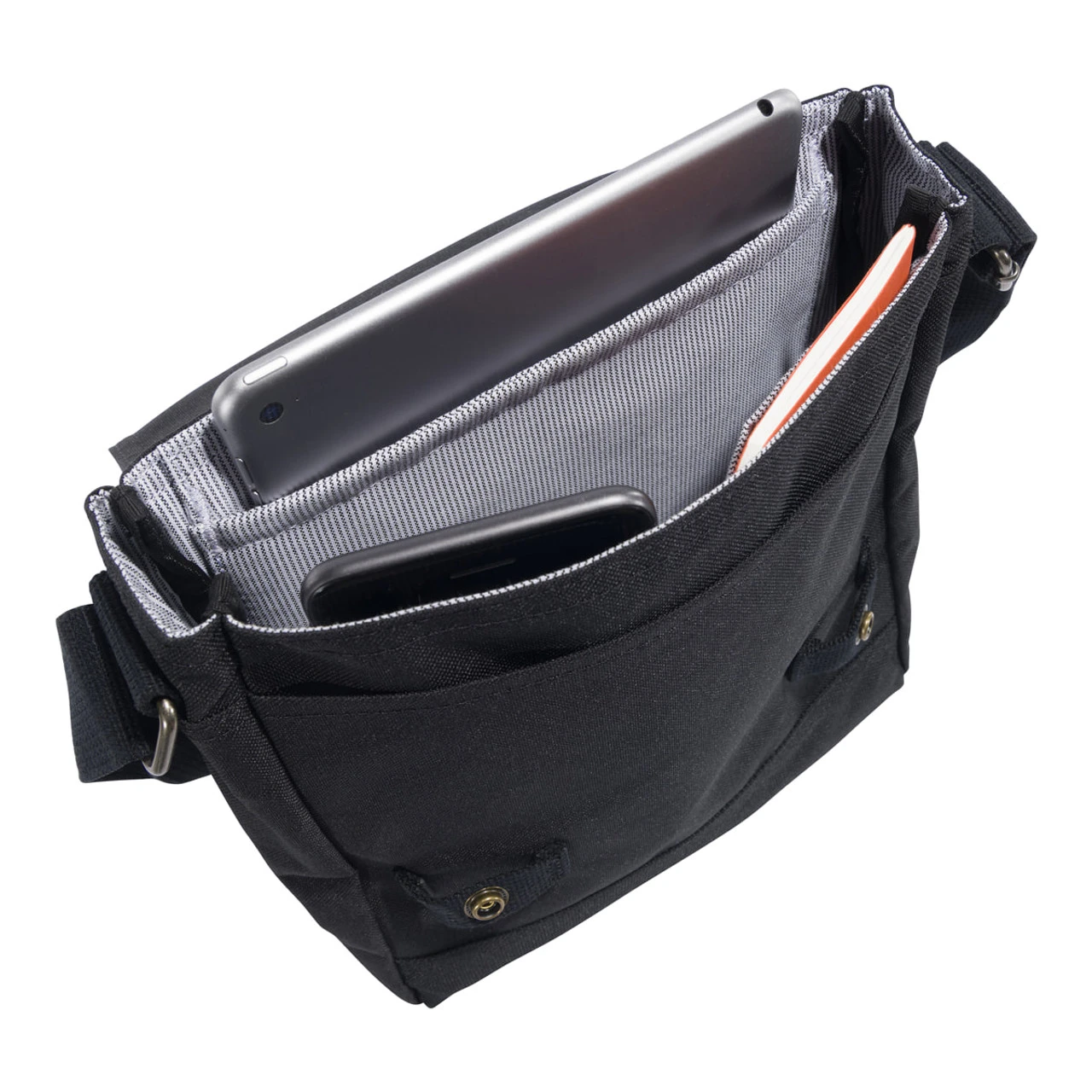 Wear this streamlined crossbody bag in the field or on your commute to keep essentials within easy reach. It’s made of durable, water-repellent fabric to stand up to heavy use. Four inside pockets hold your phone, pens and business cards. A flap with a snap closure covers the opening of the main compartment.