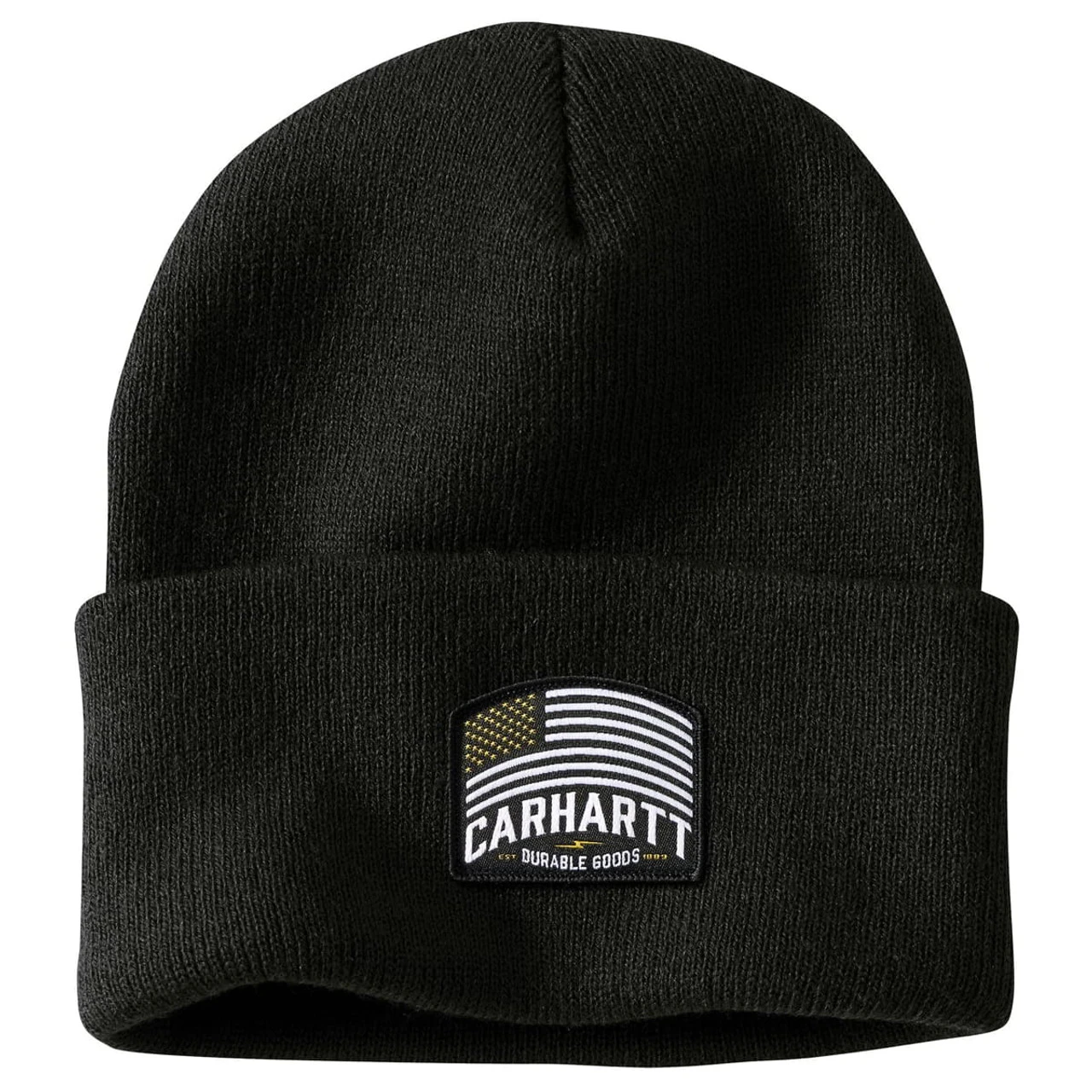 Display your patriotism with this unisex Carhartt beanie featuring an American flag on the front. The stretchy rib-knit will provide a warm feel and a perfect fit.