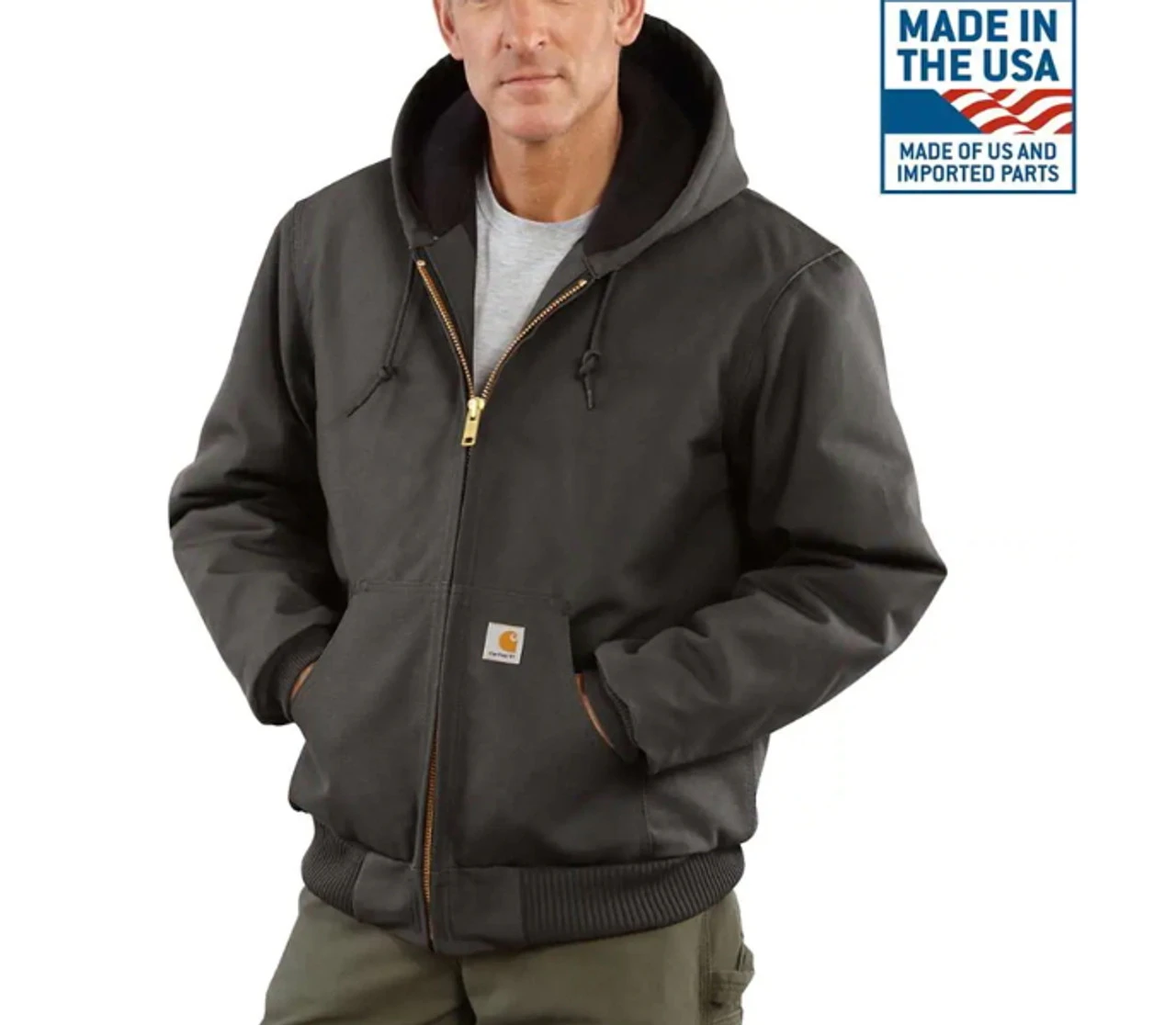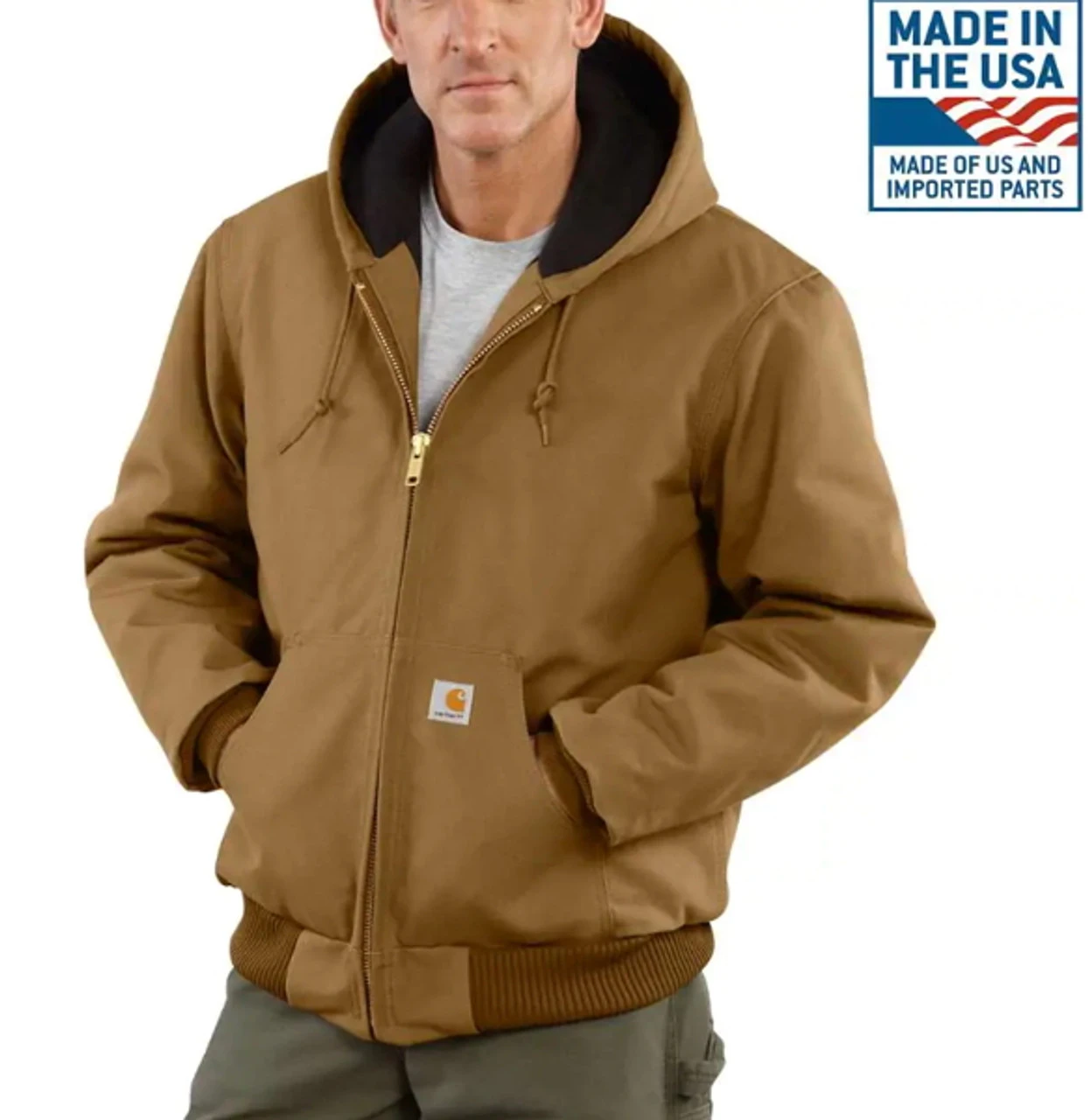 - Attached quilted-flannel-lined hood with draw-cord closure