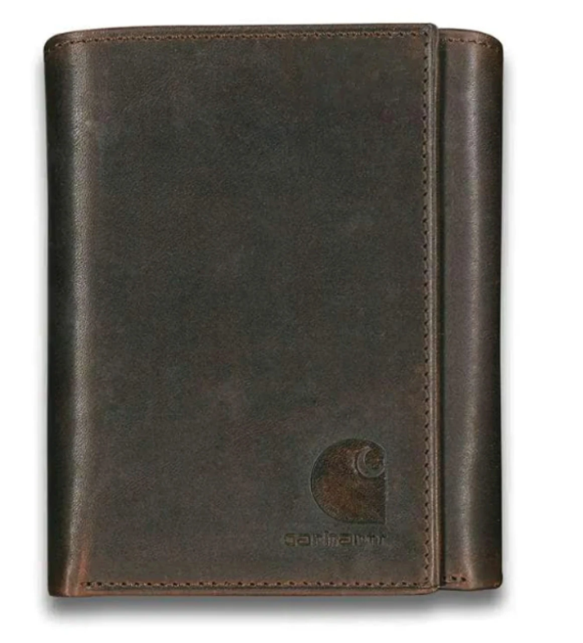 This men’s trifold wallet has a simple, old-school design. It’s made of durable full-grain leather with a rich oil finish that has a slight shine. An embossed Carhartt logo is its seal of quality.